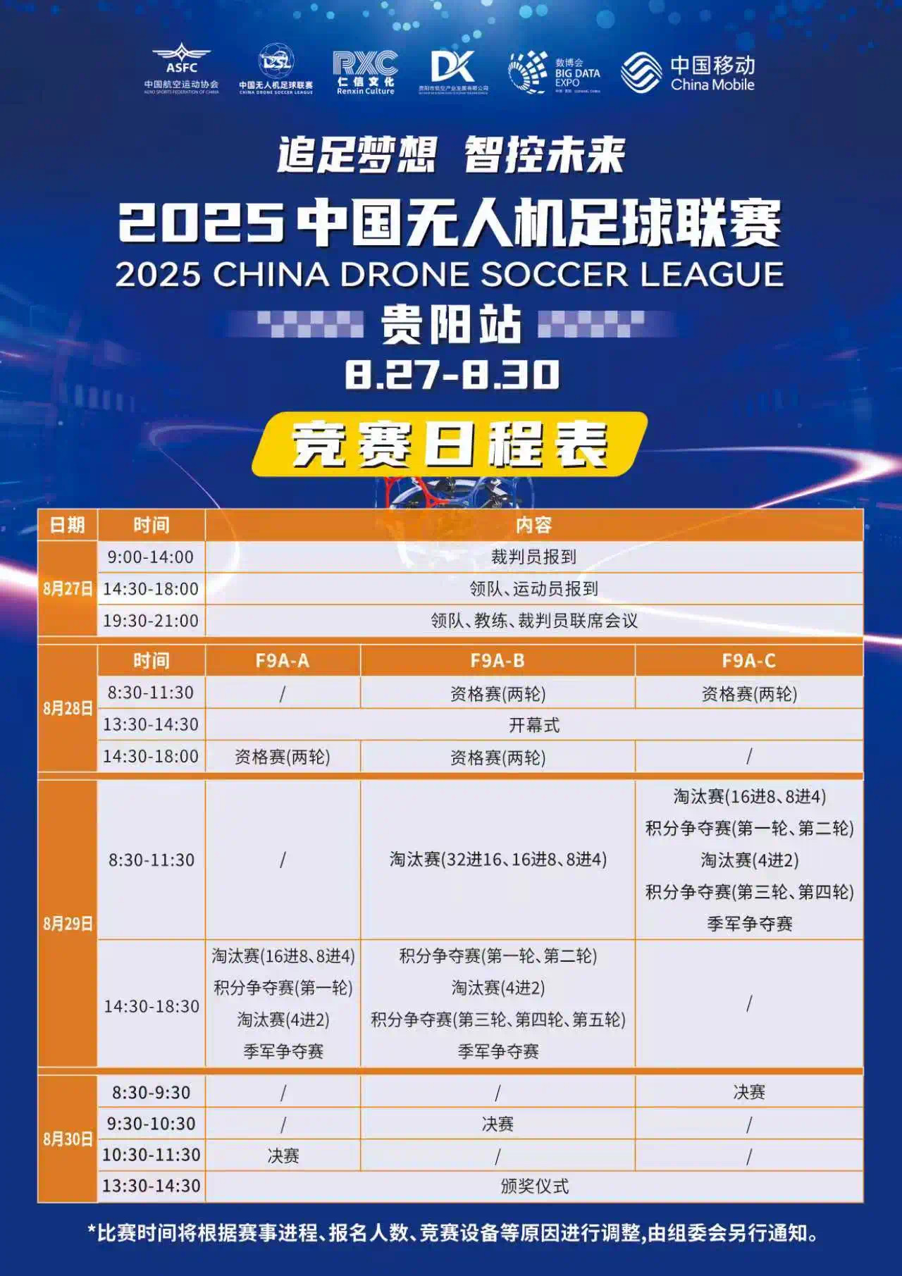2025年8月28日上午,2025年中國無人機足球聯賽(貴陽站)在貴州省貴陽市觀山湖區貴陽國際會議展覽中心5號館隆重開幕。賽事由國家體育總局航空無線電模型運動管理中心、中國航空運動協會主辦,貴陽市低空產業發展有限公司、廣州仁信文化發展有限公司承辦。作為國內首個官方認證的無人機足球聯賽,本次貴陽站與同期舉辦的中國國際大數據產業博覽會(數博會)深度聯動,共有來自全國的39支隊伍、680名運動員、領隊、教練及隨隊人員參賽,打造「數谷」貴陽科技體育的標誌性盛會。