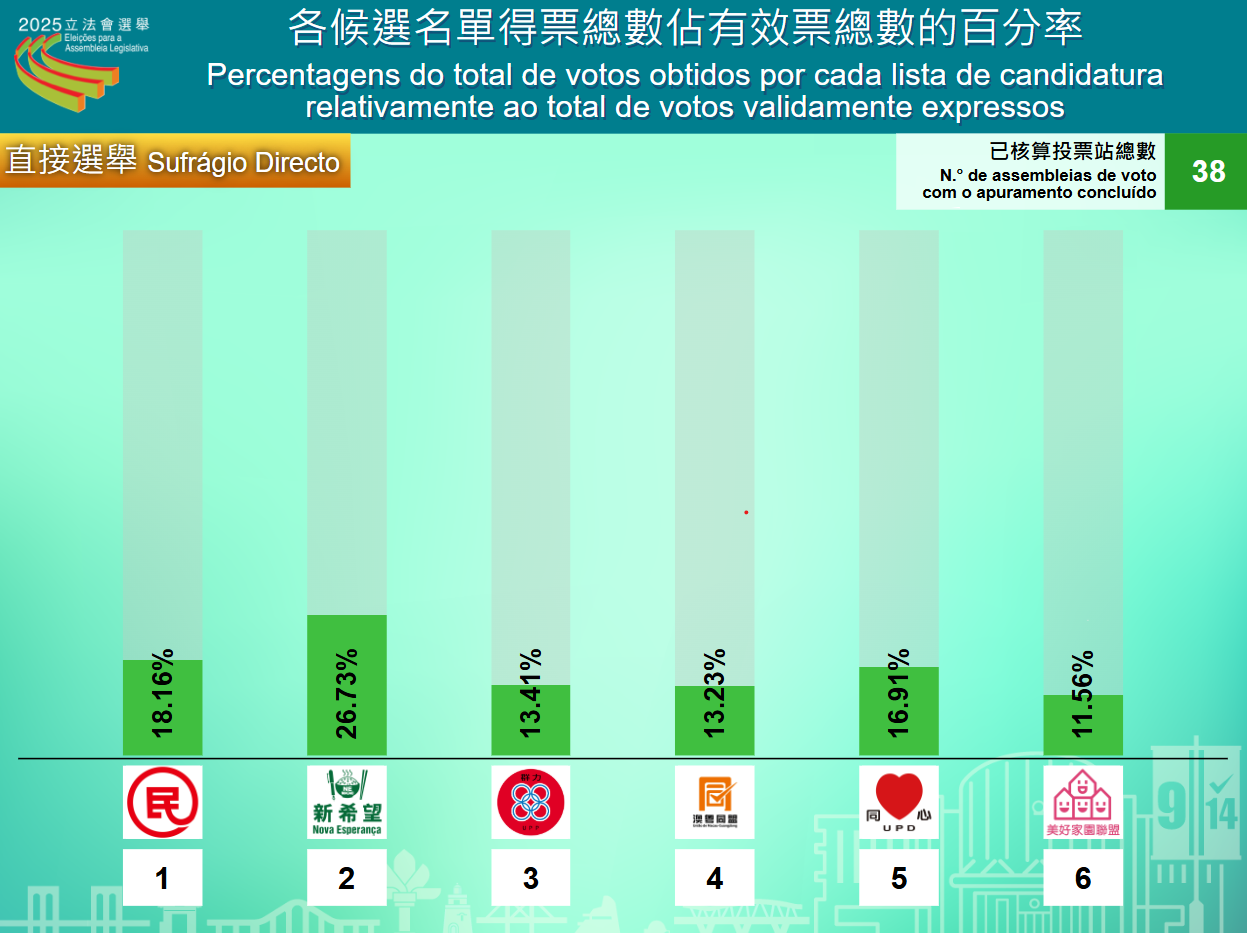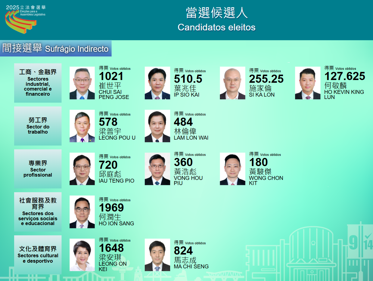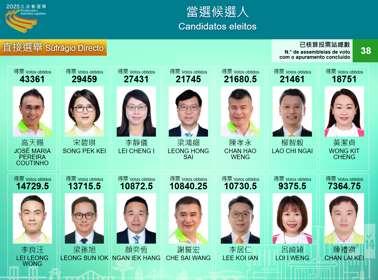 2025年立法會選舉直選點票完畢,十四位當選人按得票順序依次為:新希望高天賜、民聯宋碧琪、同心李靜儀、群力梁鴻細、新希望陳孝永、澳粵同盟柳智毅、好家園黃潔貞、民聯李良汪、同心梁孫旭、群力顏奕恆、新希望謝誓宏、澳粵同盟李居仁、好家園呂綺穎、民聯陳禮祺。