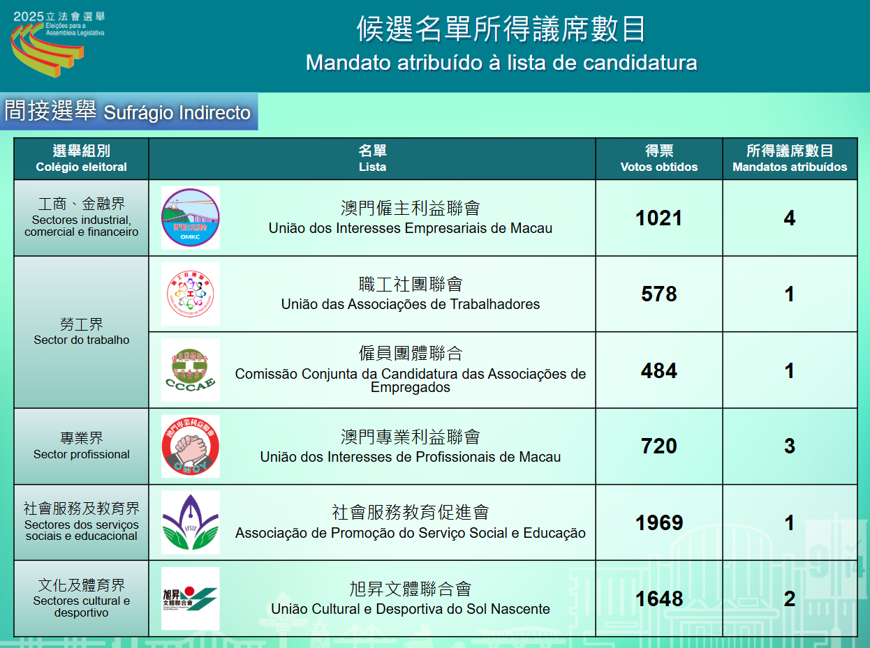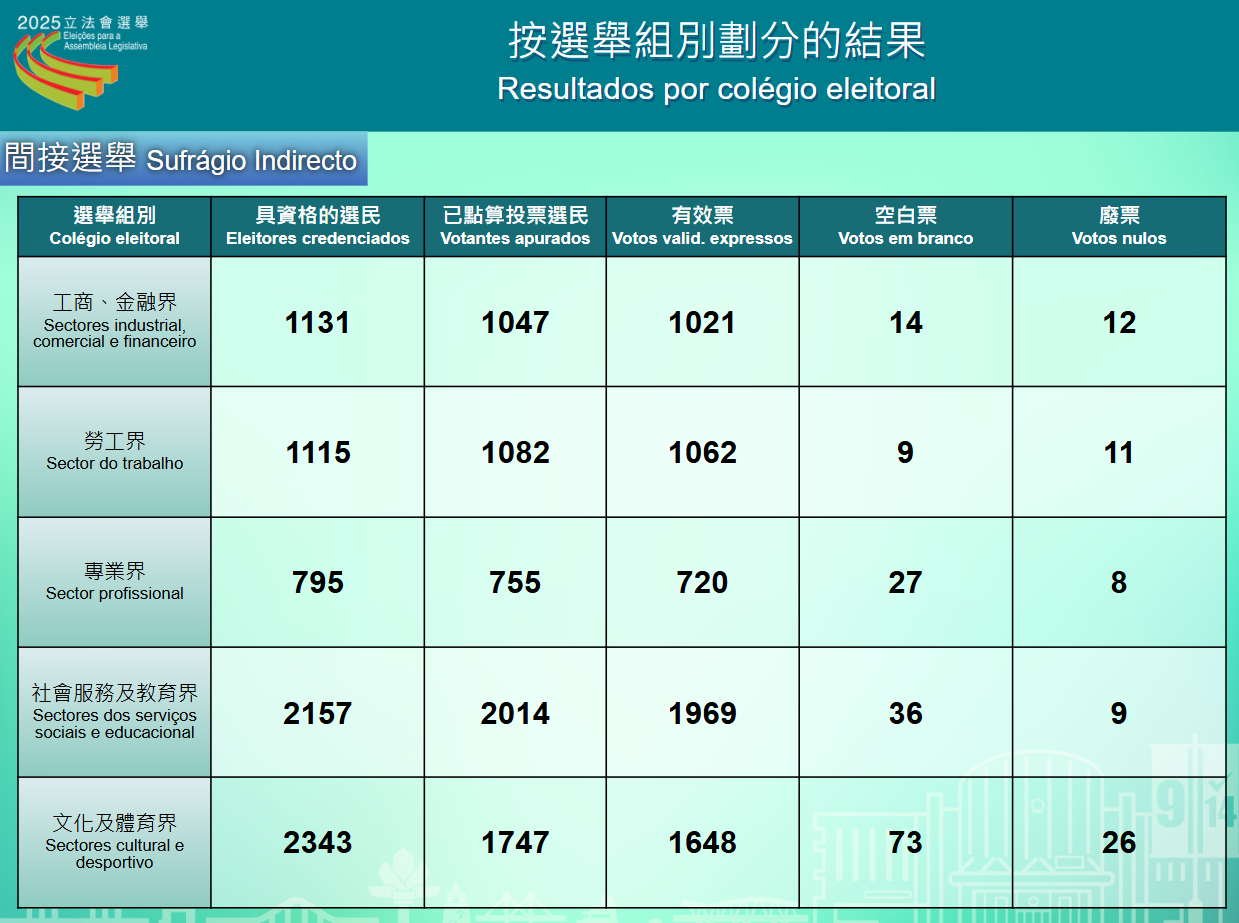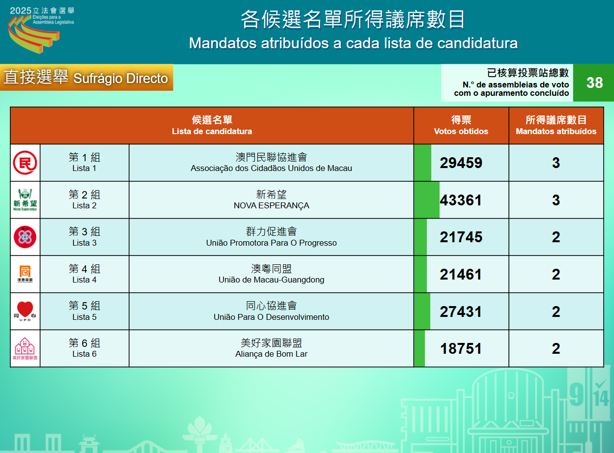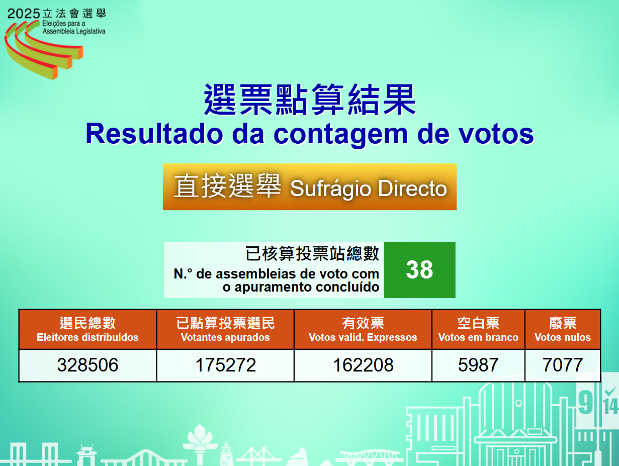 2025年立法會選舉直選點票完畢,十四位當選人按得票順序依次為:新希望高天賜、民聯宋碧琪、同心李靜儀、群力梁鴻細、新希望陳孝永、澳粵同盟柳智毅、好家園黃潔貞、民聯李良汪、同心梁孫旭、群力顏奕恆、新希望謝誓宏、澳粵同盟李居仁、好家園呂綺穎、民聯陳禮祺。