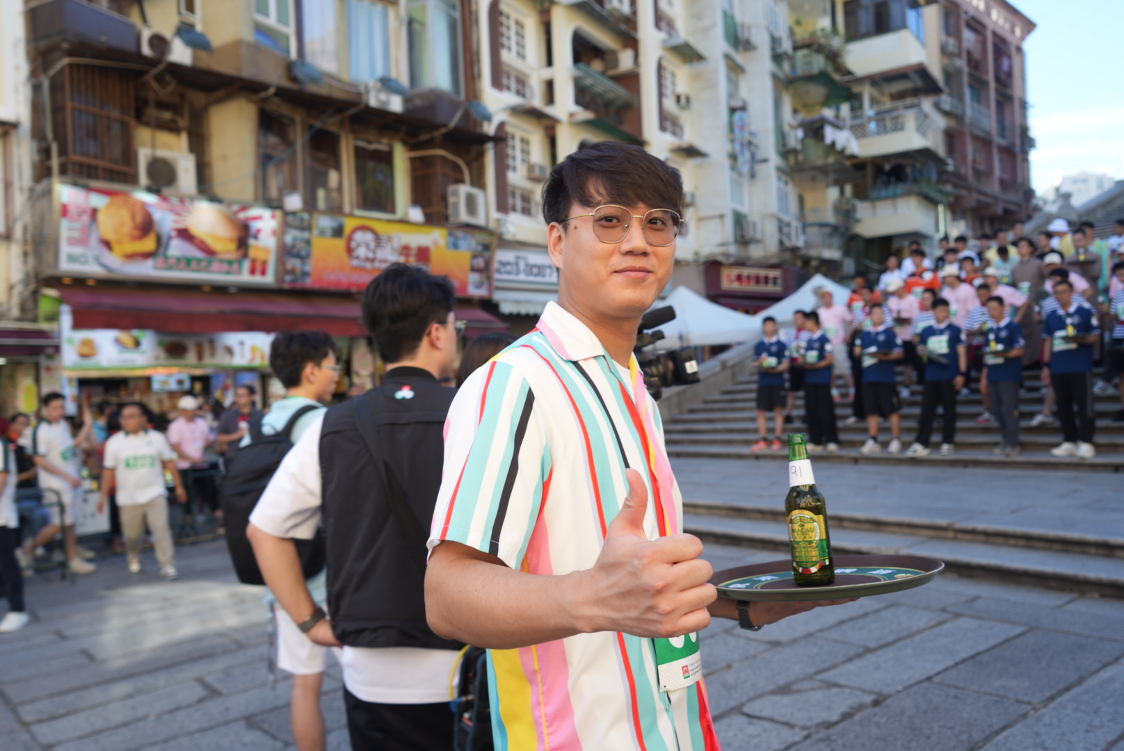 延續歷年托盤比賽傳統,澳門葡京人派出一位男子組代表及兩位女子組代表,身穿澳葡復古懷舊風服飾,手持放有一瓶啤酒的托盤,從歷史地標大三巴牌坊出發,途徑新馬路一帶熱鬧街道與人流密集的商業地段,最終抵達議事亭前地,參賽的團隊成員憑藉穩健步伐和出色的平衡技巧,在眾多參賽者中表現亮眼,贏得現場觀眾的熱烈掌聲,展現出酒店從業人員的專業訓練與活力形象。