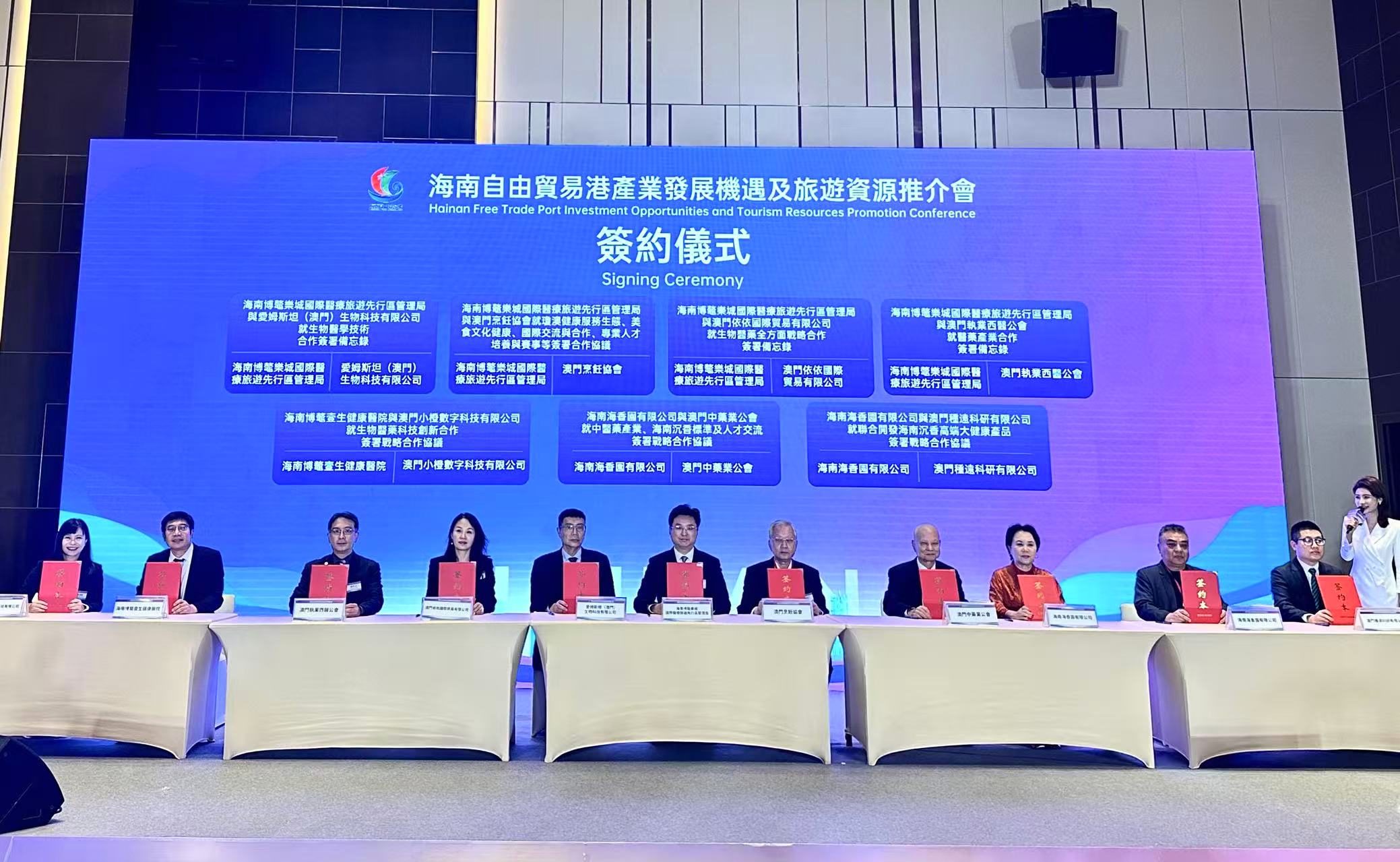 10月15日,海南自由貿易港產業發展機遇及旅遊資源推介會簽約儀式在澳門路氹連貫公路新濠天地君悅酒店宴會廳舉行。在海南省省長劉小明、澳門特別行政區政府社會文化司司長柯嵐等兩地政商界近300位嘉賓的共同見證下,現場簽約儀式於10時55分正式啟動。