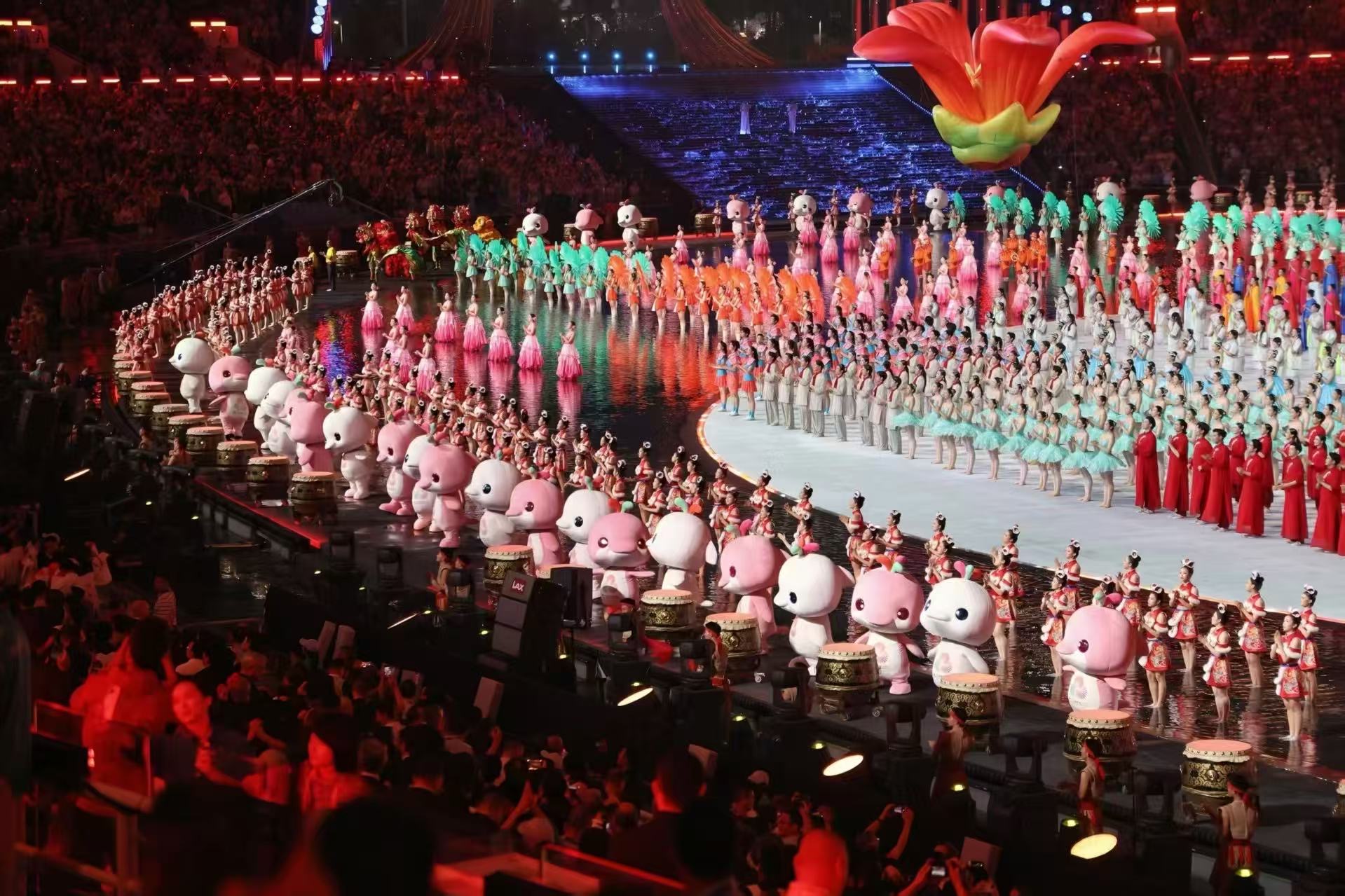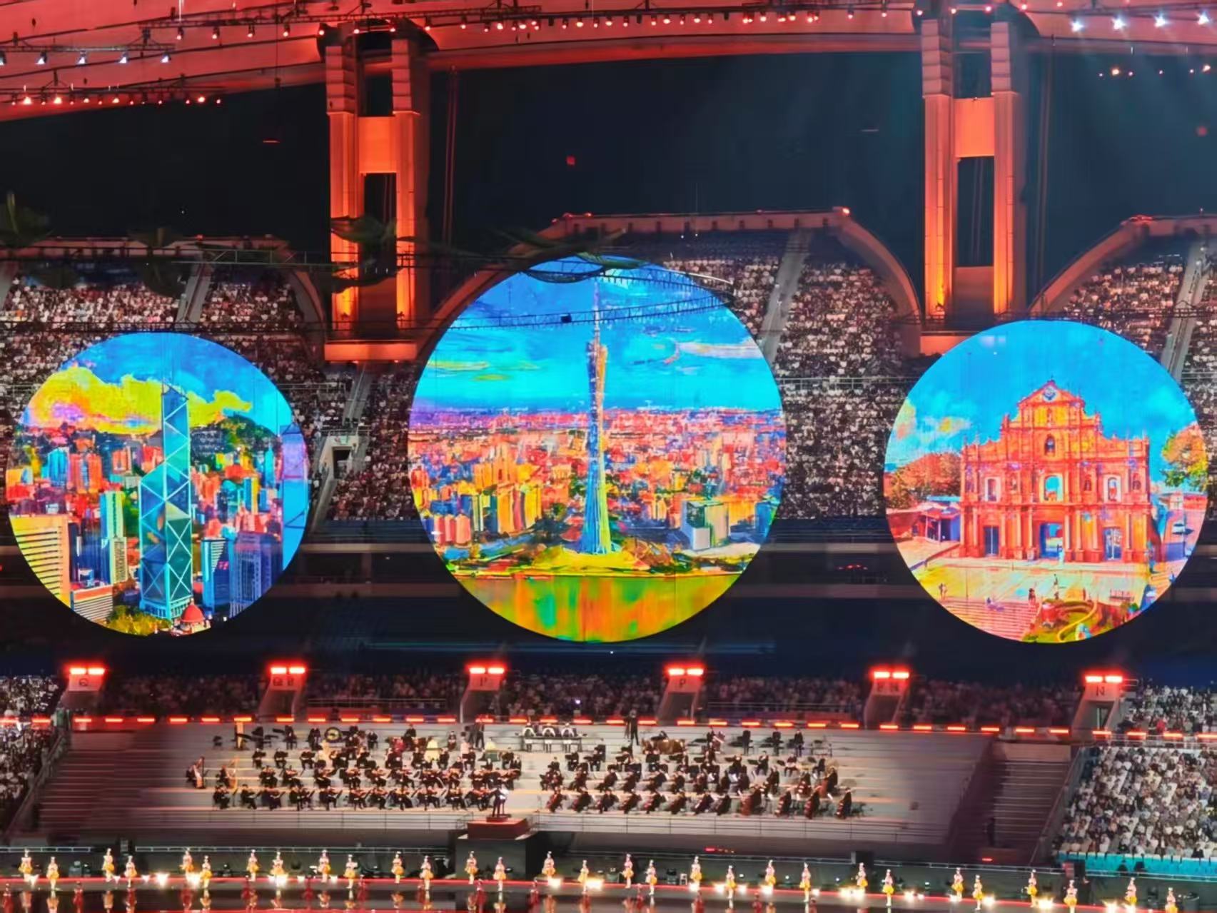 開幕式演出巧妙融入了粵港澳大灣區的標誌性景觀與文化符號,如廣州「小蠻腰」、香港維多利亞港和澳門大三巴牌坊,呈現三地互聯互通、蓬勃發展的生動圖景。主舞台以「同心圓」為設計理念,象徵粵港澳同心協力、共築未來。