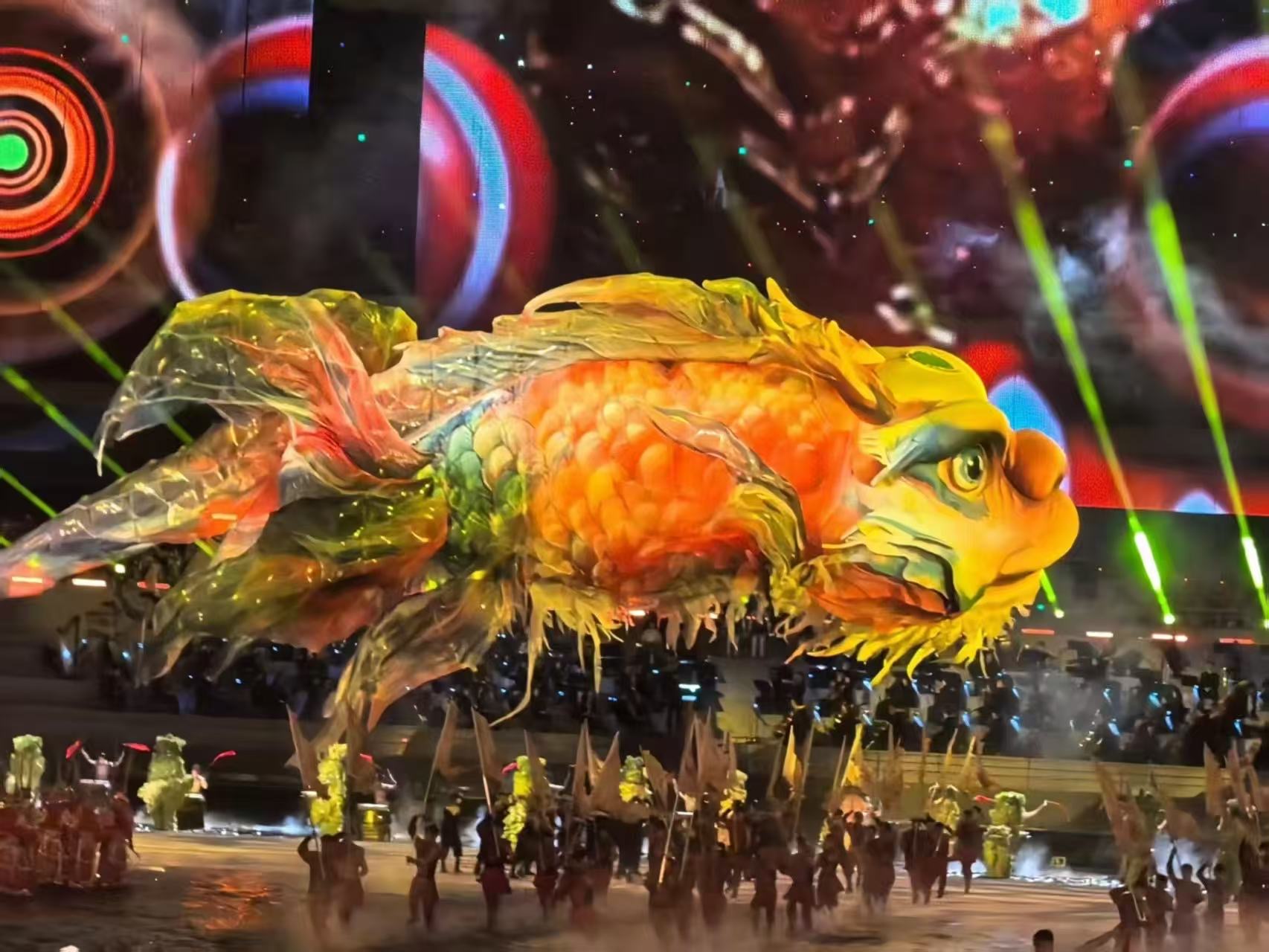 整場表演充滿濃鬱的嶺南風情,並與AI、AR等前沿科技深度融合,令人耳目一新。南拳、南棍、八斬刀、詠春拳等嶺南武術輪番上演,武者動作行雲流水、剛勁有力。上空遊動的巨型鰲魚取材自「鯉躍龍門」傳說,寓意吉祥,常見於嶺南傳統建築裝飾。