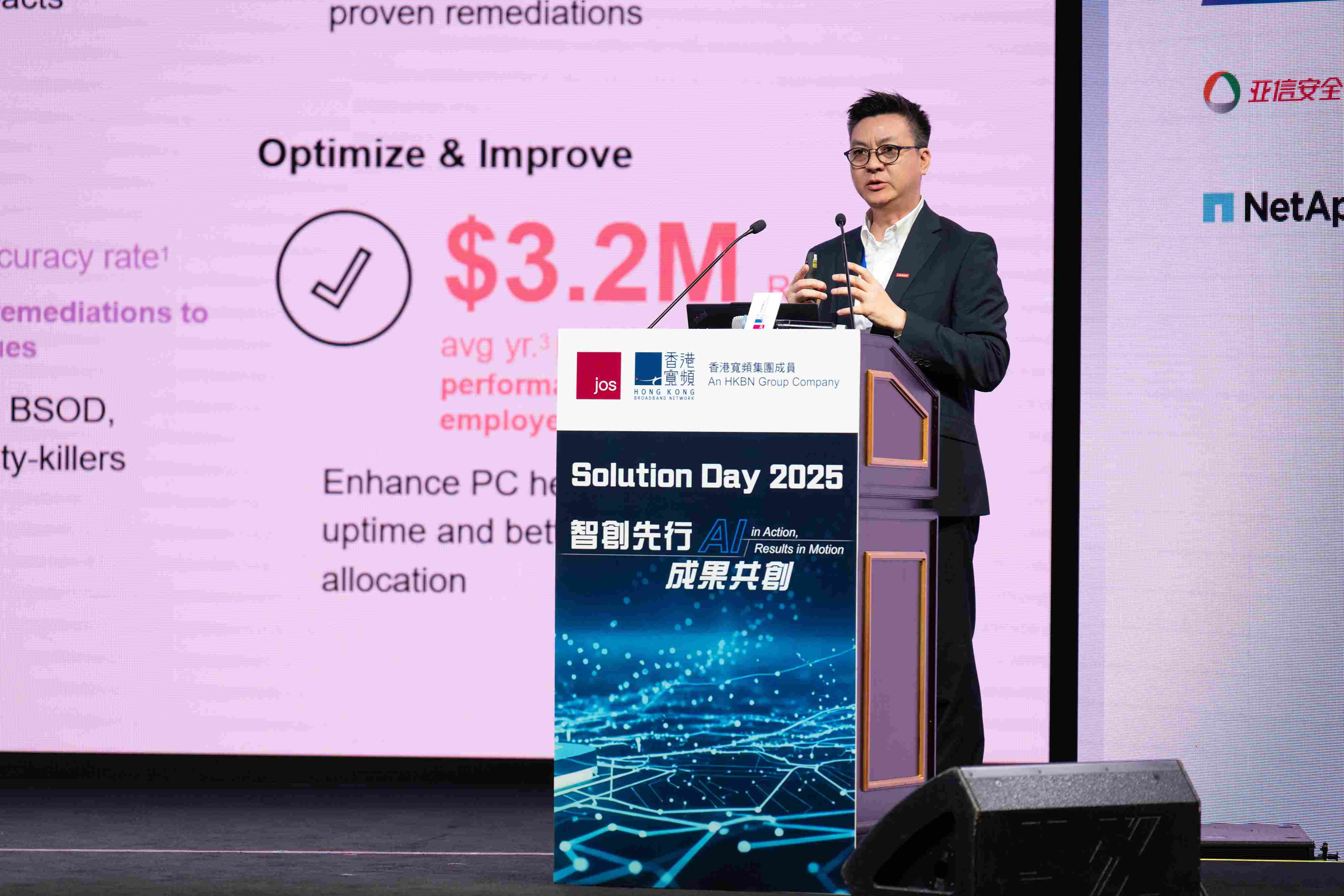 HKBN JOS(澳門)於 11 月 12 日假澳門倫敦人康萊德酒店圓滿舉行年度旗艦活動「解決方案日」,本屆以「智創先行・成果共創」為主題,匯聚逾四百名業界精英、科技專家及企業代表齊聚一堂,共同探索人工智能與創新科技在提升生活品質、重塑企業運營模式、啟發創新思維、推動澳門經濟適度多元化及助力本地人才培育等領域的深遠價值。是次活動不僅吸引超過 40 家來自兩岸四地及國際的頂尖科技企業參展,帶來豐富的創新技術展示,更憑藉參與人數與活動規模雙雙創下歷屆新高,充分彰顯其作為澳門業界年度盛事的強大影響力。