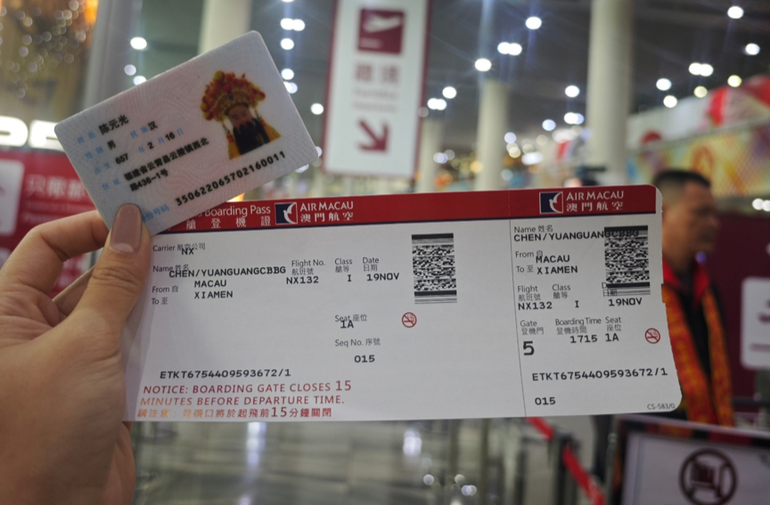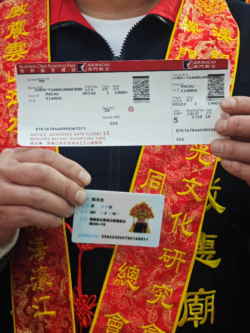 11月19日开漳圣王陈元光以实名身份证完成购票登上澳门航空 NX132 航班,千年信仰,以特别旅客身份启航。