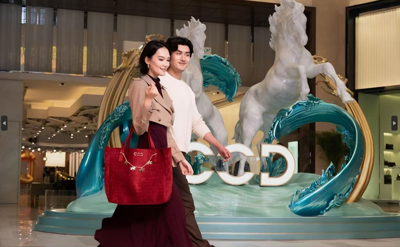 與此同時,更多別具一格的藝術裝置分佈在新濠天地的室內空間,繼續以極具藝術美感的方式演繹「馬」的靈敏姿態。金光大道入口處,兩匹駿馬雕塑於水景之中競相追逐,線條流暢、動感十足,結合光影生動詮釋「乘風破浪」的美好寓意。此外,連接輕軌站入口處的戶外空間亦以金色駿馬藝術裝置點綴,自抵達新濠天地,賓客便能沉浸於精心營造的策馬迎春氛圍之中。室內外空間的現代建築語言與傳統生肖主題巧妙融合,呈現新濠天地一貫的藝術美學。