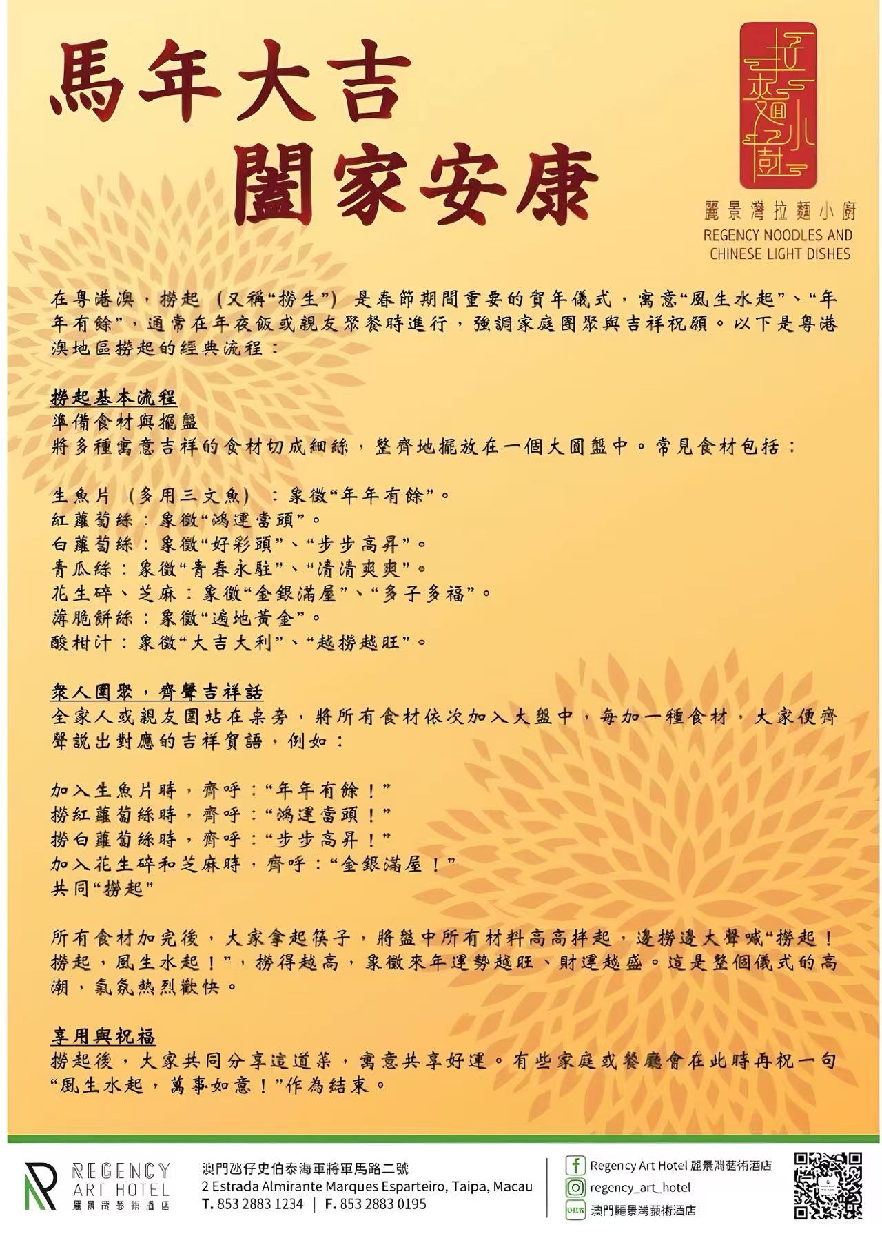為迎接丙午馬年的到來,麗景灣藝術酒店將於新春期間 呈獻吉祥寓意,以粵港澳及東南亞地區新春傳統的「撈起」儀式為靈感的賀年菜式—— 「撈到風生水起」,並由酒店廚藝團隊以藝術美感重新演繹,為賓客及家庭帶來一個互 動有趣、寓意豐饒的新春用餐體驗,共祈求馬年一馬當先、萬事順遂。