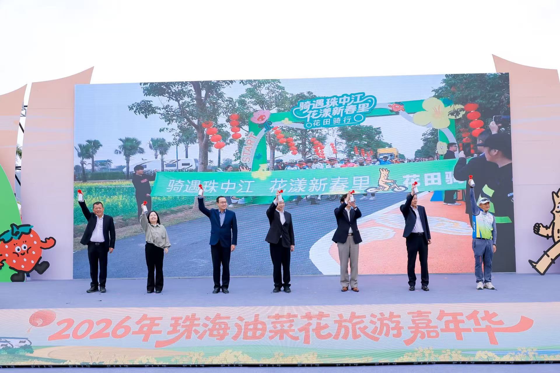 開幕式尾聲,「騎遇珠中江」珠中江花田騎行活動正式啟動,來自粵港澳的100位自行車愛好者穿梭於千畝油菜花田間,成為春日裡的一道風景線。珠中江三地還攜手打造九條特色騎行線路,珠海線路融合自然生態與人文韻味,中山線路串聯花田與水鄉風情,江門線路盡顯碉樓遺產與僑鄉古韻,以車輪為紐帶串聯珠西春日美景。