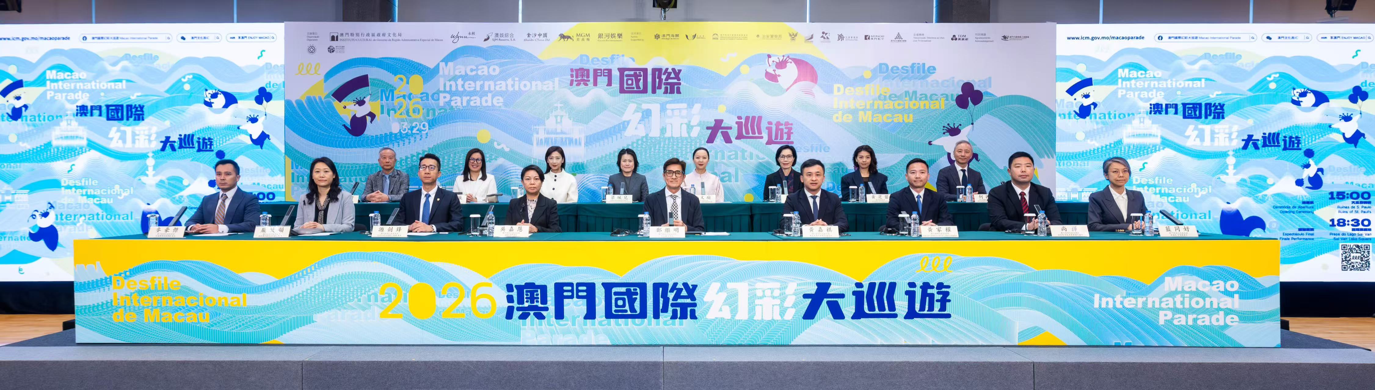 大巡遊新聞發佈會今日(3月12日)在澳門文化中心舉行,文化局代局長鄭繼明,澳門海關助理關長吳嘉慧,教育及青年發展局副局長黃嘉祺,治安警察局策劃行動廳廳長源劍鋒,體育局澳門格蘭披治大賽車及大型體育活動廳廳長黃家權,市政署文康及公民教育廳廳長龎筱韻,消防局研究及策劃廳代廳長尚樺,交通事務局協調處處長麥豪傑,旅遊局市場處處長藍同好,永利澳門有限公司綜合度假村市場策略營銷總裁鄒文瑜,澳娛綜合度假股份有限公司企業品牌發展及市場推廣部市場推廣及傳訊高級副總裁梁珮兒,金沙中國有限公司企業傳訊及社會事務副總裁江慧賢,美高梅公共及社會事務高級副總裁王如茵,銀河娛樂集團公共關係助理高級副總裁黃芝蓉,澳門航空股份有限公司市場部總經理袁立敏,澳門廣播電視股份有限公司節目及製作部、傳訊事務部總監何振明,澳門街坊會聯合總會副會長李卓君及中區南區工商聯會理事長胡玉沛等出席。