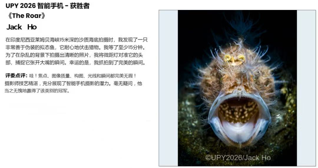 緊隨UPA大賽之後,被譽為「全球規模最大、最具聲望」的水下攝影殿堂級賽事——2026年英國UPY國際水下攝影比賽頒獎典禮在倫敦順利啟幕。初登該頂級賽場的倬樑,憑藉扎實的拍攝功底與獨特的鏡頭表達,再度驚艷國際評審團。他提交的奪冠作品《吶喊》拍攝於印尼藍碧,精準定格了襞魚張嘴的震撼瞬間,作品極致的細節呈現與恰如其分的光線把控,獲得評審們「焦點、影像品質、光線和時間都完美」的高度讚譽,最終倬樑成功奪冠,成為本屆大賽唯一的中國冠軍。