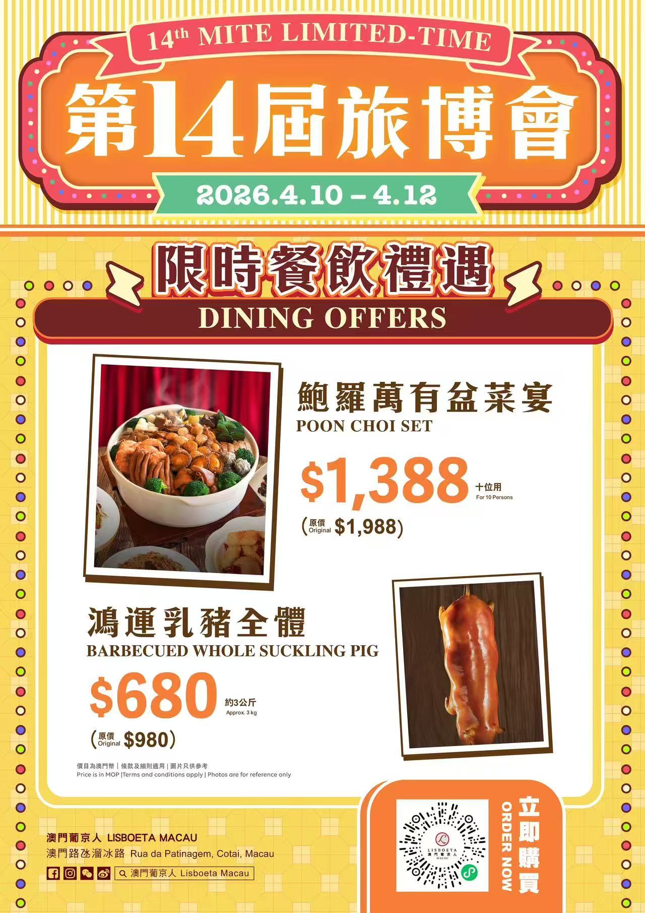 澳門葡京人在旅博會期間,特別推出「限定餐飲優惠禮遇」,讓訪客享受獨家折扣。燊哥冰室提供多款曲奇餅禮券,讓訪客以優惠價品嚐地道美食。同時推出「鮑羅萬有盆菜宴」禮券,優惠價每圍澳門幣1,388 元,訪客與家人朋友在充滿情懷的「懷舊澳門街」共享豐盛食材,體驗幸福共聚時光;此外「鴻運乳豬全體」禮券亦以優惠價澳門幣680 元推出,選用優質乳豬(約重3 公斤)以傳統秘方醃製並專業烤制,外皮金黃酥脆、肉質鮮嫩多汁,香氣濃郁、外觀完整,適合家庭聚餐、節慶宴請及商務宴會。