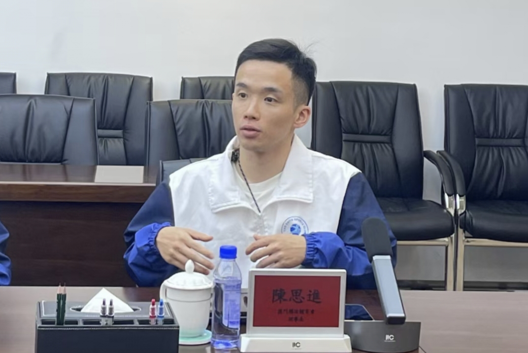 理事長陳思進分享了體育會在這一段時間推廣體育運動、培訓運動員及組織賽事方面的成就與經驗,亦就橫琴體育產業如何和澳門互動這一方面作交流。