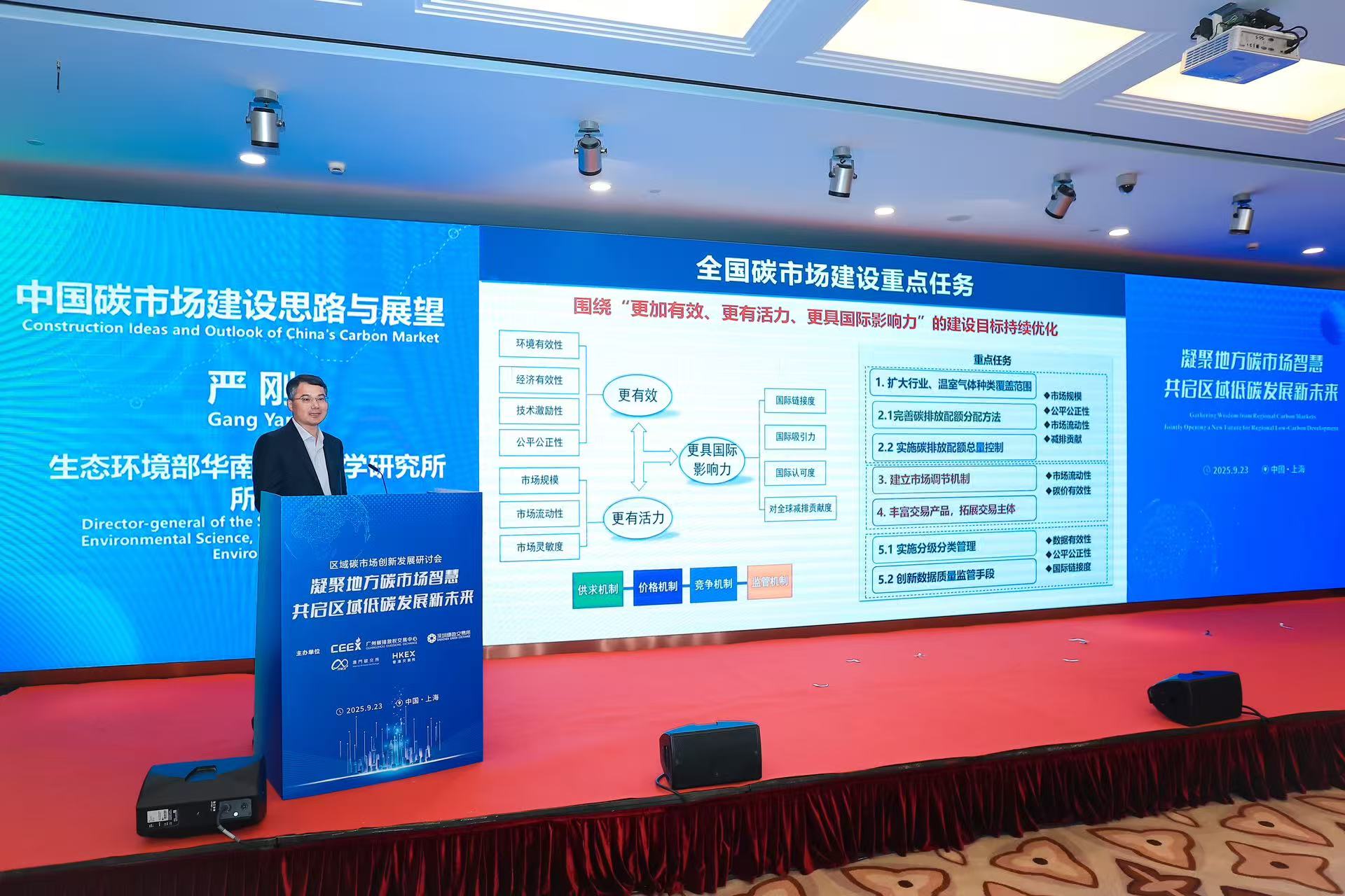 2025年9月23日下午,由廣州碳排放權交易中心、深圳綠色交易所、澳門國際碳排放權交易所及香港交易所聯合主辦的「區域碳市場創新發展研討會」在上海成功舉辦。生態環境部副部長李高出席會議並致辭。來自生態環境部有關部門和單位、相關省市生態環境部門代表,國內外碳市場交易機構和碳領域相關企業、行業協會、金融機構、技術服務機構代表,高校、科研院所碳領域相關專家學者等約160位代表參加會議,共探中國特色區域碳市場發展路徑,為全球氣候治理貢獻中國力量。
