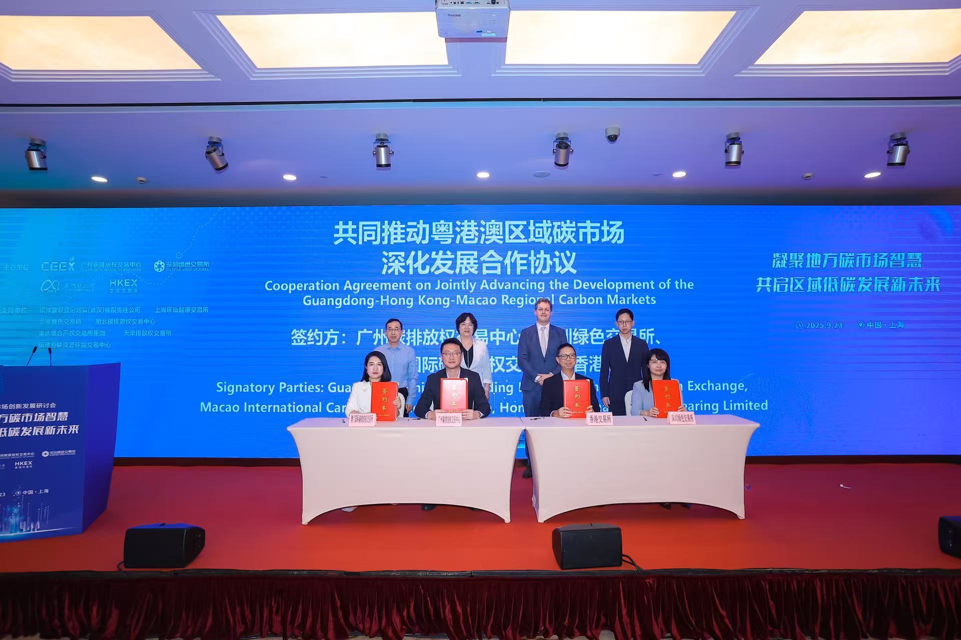 會上,廣州、深圳、澳門、香港碳交易機構代表共同簽署了《共同推動粵港澳區域碳市場深化發展合作協議》,標誌著粵港澳三地碳市場協同發展邁出實質性步伐,是粵港澳三地共同推進粵港澳大灣區美麗中國先行區建設的具體行動。