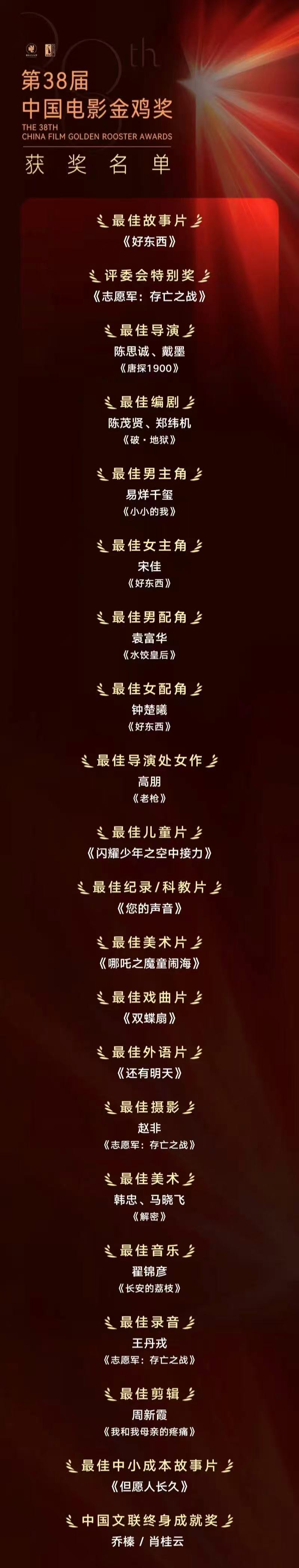 在頒獎典禮上,《好東西》獲最佳故事片獎,《志願軍:存亡之戰》獲評委會特別獎,易烊千璽、宋佳分獲最佳男主角與最佳女主角。喬榛、肖桂雲榮獲中國文聯終身成就獎(電影)。