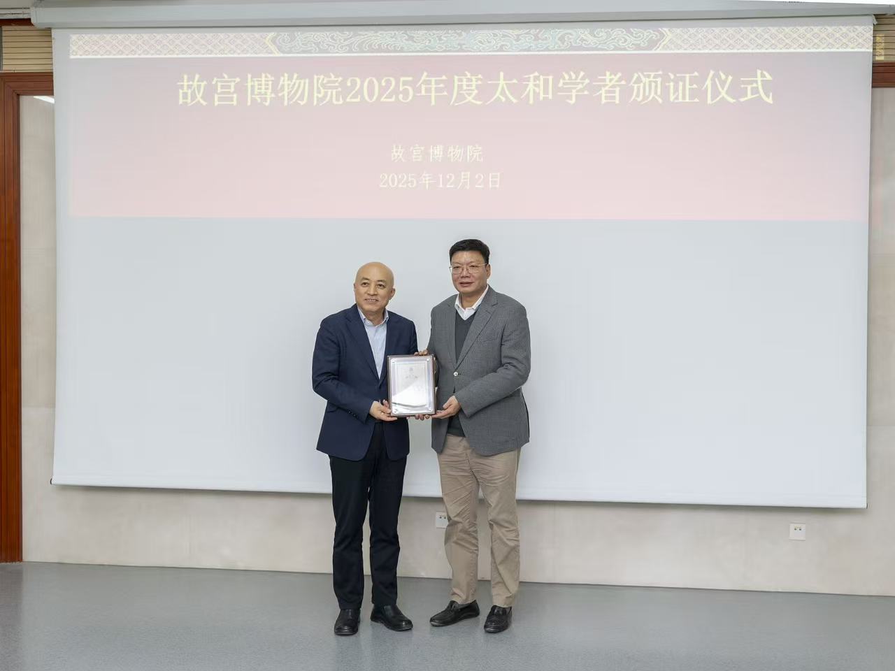 2025年12月2日下午,故宮博物院院長王旭東向港澳地區首位太和學者趙強博士頒發證書。趙強向與會專家學者分享了克拉克瓷與汕頭器研究成果,院長王旭東、副院長王躍工聆聽了趙強的講座。