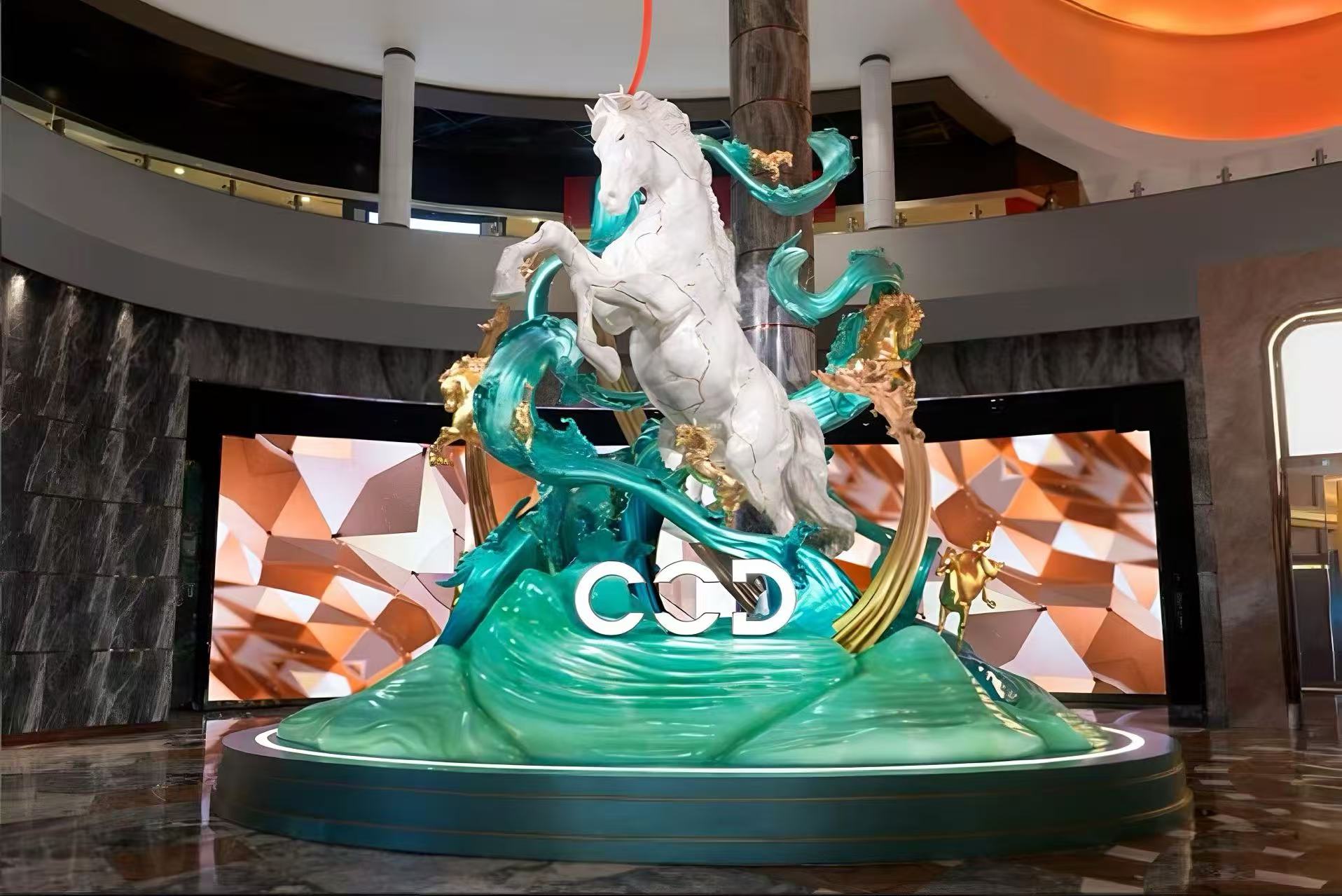 與此同時,更多別具一格的藝術裝置分佈在新濠天地的室內空間,繼續以極具藝術美感的方式演繹「馬」的靈敏姿態。金光大道入口處,兩匹駿馬雕塑於水景之中競相追逐,線條流暢、動感十足,結合光影生動詮釋「乘風破浪」的美好寓意。此外,連接輕軌站入口處的戶外空間亦以金色駿馬藝術裝置點綴,自抵達新濠天地,賓客便能沉浸於精心營造的策馬迎春氛圍之中。室內外空間的現代建築語言與傳統生肖主題巧妙融合,呈現新濠天地一貫的藝術美學。