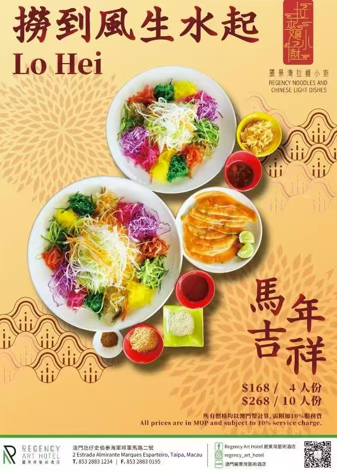 為迎接丙午馬年的到來,麗景灣藝術酒店將於新春期間 呈獻吉祥寓意,以粵港澳及東南亞地區新春傳統的「撈起」儀式為靈感的賀年菜式—— 「撈到風生水起」,並由酒店廚藝團隊以藝術美感重新演繹,為賓客及家庭帶來一個互 動有趣、寓意豐饒的新春用餐體驗,共祈求馬年一馬當先、萬事順遂。