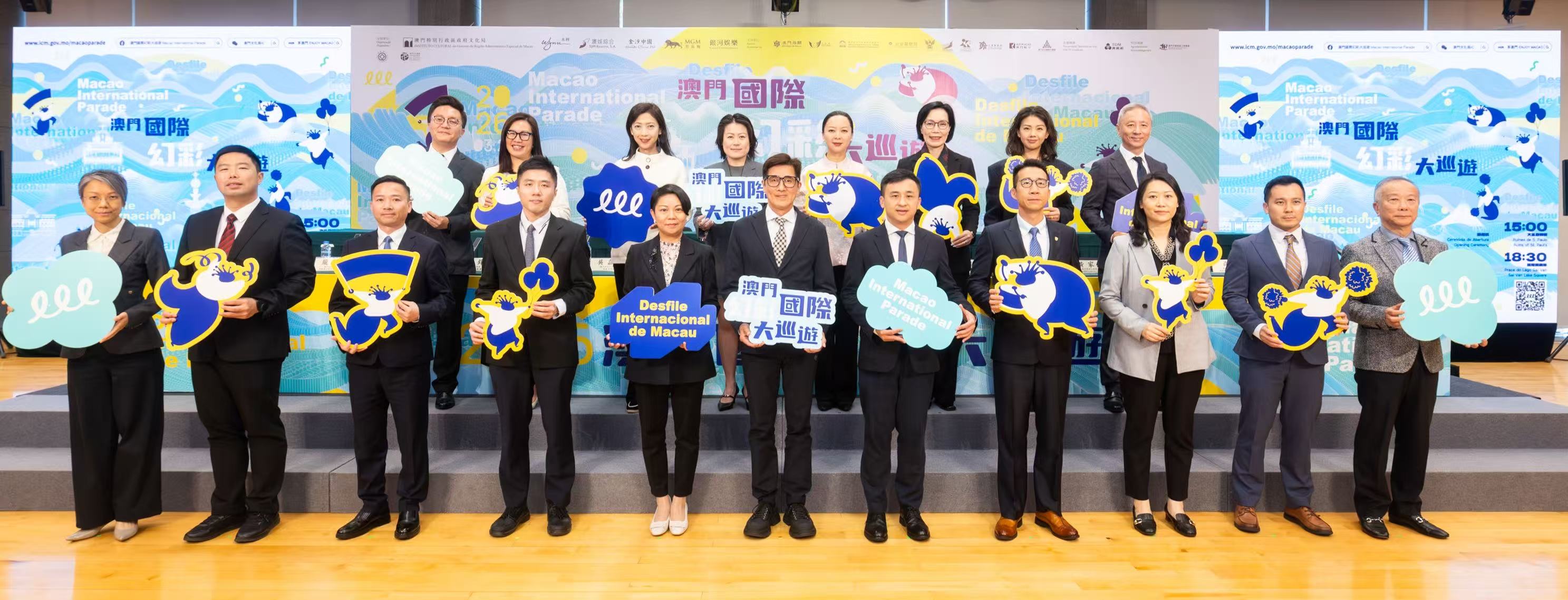 大巡遊新聞發佈會今日(3月12日)在澳門文化中心舉行,文化局代局長鄭繼明,澳門海關助理關長吳嘉慧,教育及青年發展局副局長黃嘉祺,治安警察局策劃行動廳廳長源劍鋒,體育局澳門格蘭披治大賽車及大型體育活動廳廳長黃家權,市政署文康及公民教育廳廳長龎筱韻,消防局研究及策劃廳代廳長尚樺,交通事務局協調處處長麥豪傑,旅遊局市場處處長藍同好,永利澳門有限公司綜合度假村市場策略營銷總裁鄒文瑜,澳娛綜合度假股份有限公司企業品牌發展及市場推廣部市場推廣及傳訊高級副總裁梁珮兒,金沙中國有限公司企業傳訊及社會事務副總裁江慧賢,美高梅公共及社會事務高級副總裁王如茵,銀河娛樂集團公共關係助理高級副總裁黃芝蓉,澳門航空股份有限公司市場部總經理袁立敏,澳門廣播電視股份有限公司節目及製作部、傳訊事務部總監何振明,澳門街坊會聯合總會副會長李卓君及中區南區工商聯會理事長胡玉沛等出席。