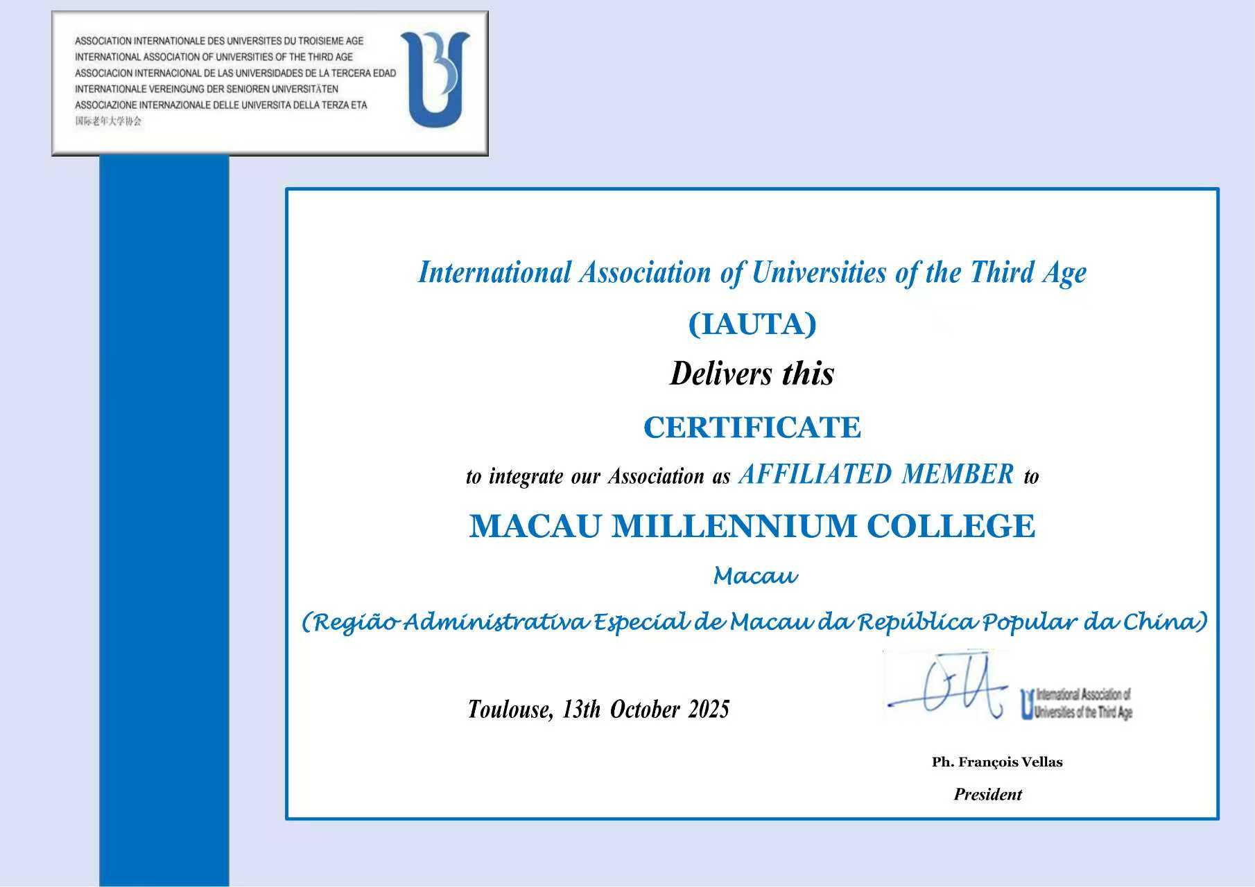 同時,中西銀齡書院正式獲准加入擁有五十餘年歷史的IAUTA,成為澳門地區首個獲該國際權威組織認可的長者教育機構。這不僅是對銀齡書院辦學理念、課程品質與社會貢獻的充分肯定,也將為其未來發展帶來更豐富的國際資源、學術交流平台及合作機遇。