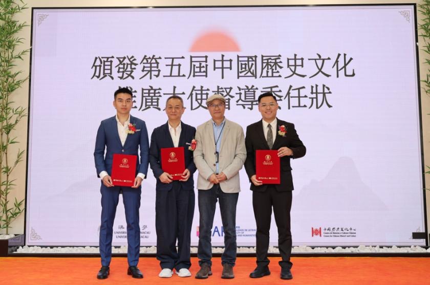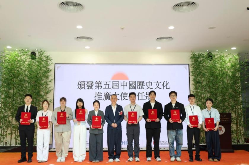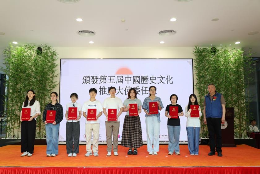 由澳門大學中國歷史文化中心主辦的「第五屆中國文化推廣大使成立儀式暨《蕩氣迴腸》系列活動——愛國主義電影欣賞」,於2026年3月25日在澳門大學崇文樓舉行。澳門天師道文化促進會會長顧羅軍、執行會長施正倫、美高梅區域業務總監蘇文、澳門大學人文學院院長徐杰、中國歷史文化中心主任張彥、副主任鄭寧人、學術研究部主任邵朝陽等嘉賓出席。